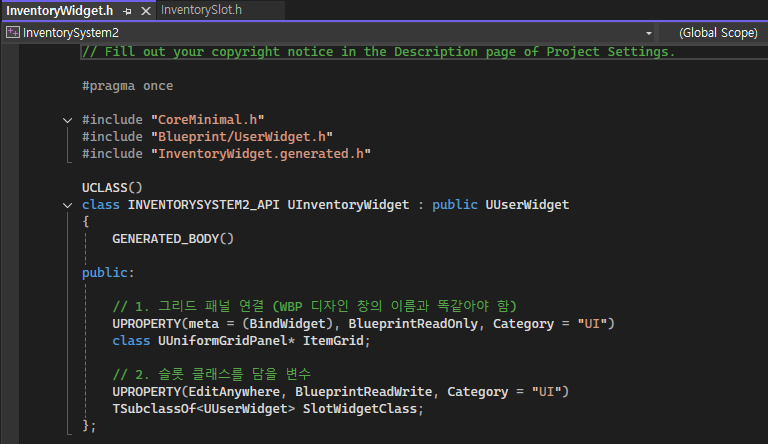 "InventorySlot.h" 에선 나중에 "FItemData"를 지정할 수 있게 "Fstring"으로 임시로 이름만 받도록했습니다.