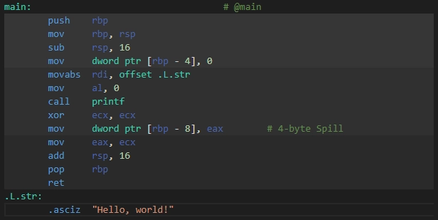 숫자가 아닌 문자이기에 사람에 좀 더 친숙한 언어. 이진 패턴의 특정 부분을 문자로 치환합니다. 그래서 기계어와 어셈블리어는 일대일 대응 관계를 가집니다. 양은 비교적 줄지 않았습니다. 모양만 예뻐진 언어라고 비유할 수 있습니다.